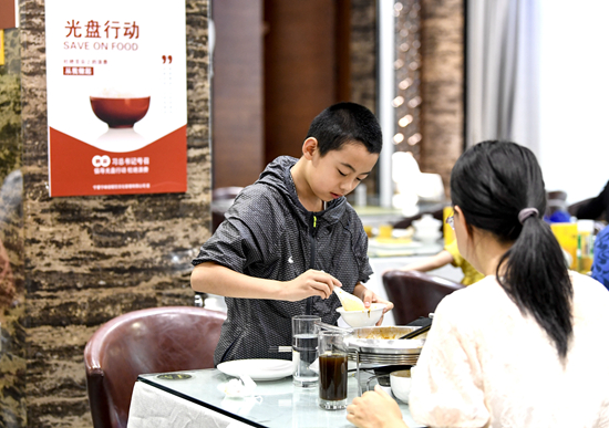 8月15日,記者走進位于內蒙古自治區呼和浩特市的一家粵菜餐廳,一進門就看到倡導“光盤行動”的海報,每張餐桌旁也都張貼著“節約糧食”“使用公筷”的標語。