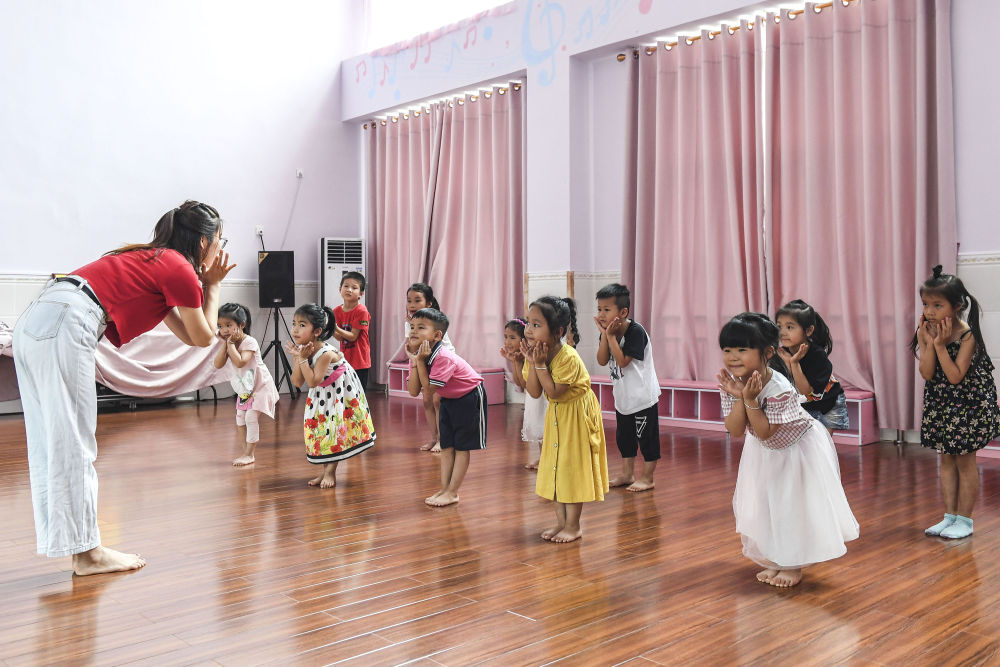 ↑廣西興業(yè)縣幼兒園老師與小朋友一起排練節(jié)目?