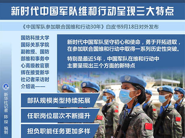 新華社北京9月18日電(記者黎云、張汨汨)《中國軍隊參加聯合國維和行動30年》白皮書18日對外發布。國防科技大學國際關系學院副教授、國防部維和事務中心高級教官蔡輝在接受新華社記者采訪時介紹說,新時代中國軍隊堅守初心和使命,勇于開拓進取,在參加聯合國維和行動中取得一系列歷史性突破。特別是最近5年,中國軍隊在維和行動中主要呈現出三個方面的新特點。