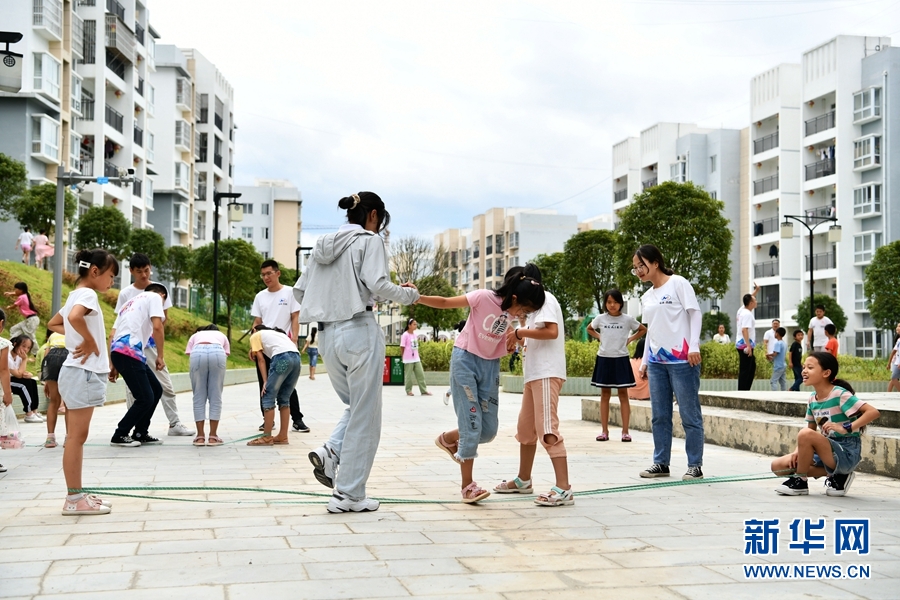 8月13日,在貴州省思南縣雙塘街道麗景社區(qū)易地扶貧搬遷安置點(diǎn),孩子們和志愿者一起跳皮筋。新華社記者 楊文斌 攝