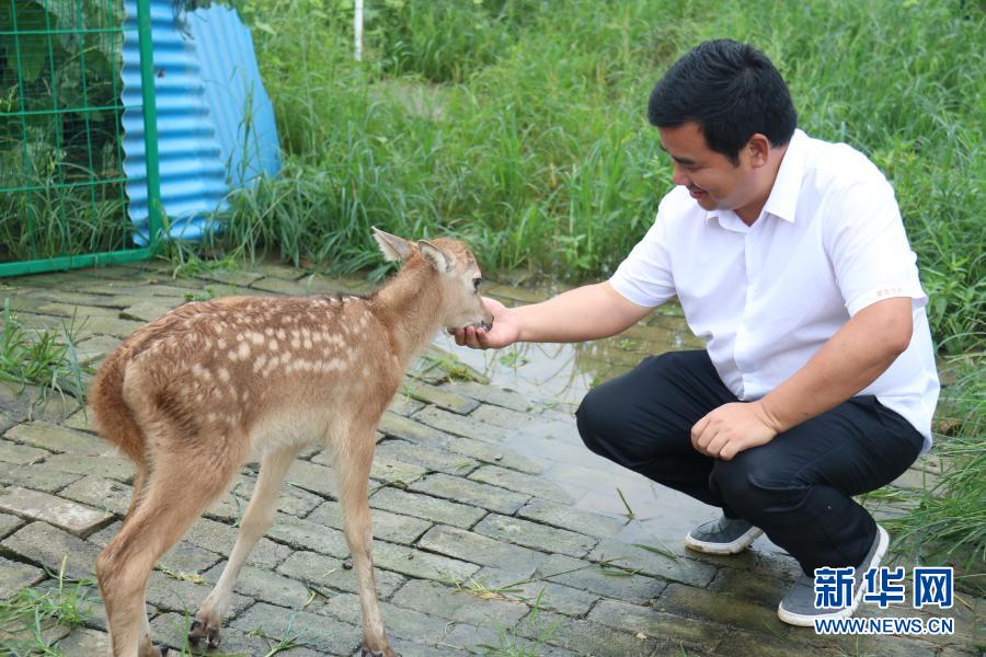 東洞庭湖麋鹿保護(hù)協(xié)會會長李政與小麋鹿“果果”互動(7月8日攝)。新華社記者 蔡瀟瀟 攝