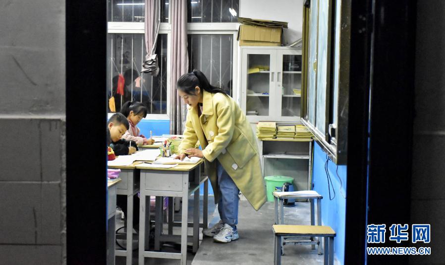 11月17日晚,在河南省洛陽市嵩縣德亭鎮酒店小學,王予川檢查學生作業。新華社記者 韓朝陽 攝