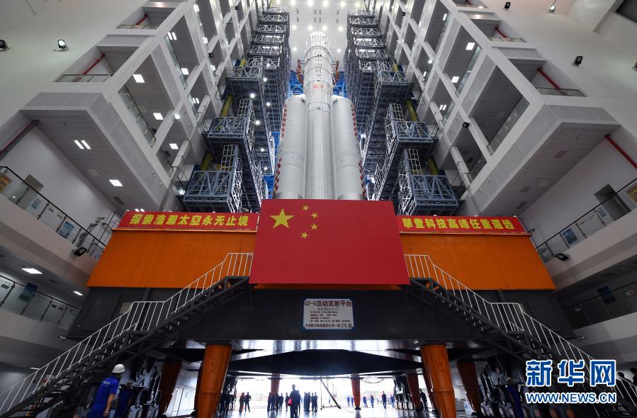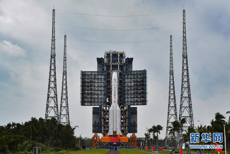 11月17日,長征五號遙五運載火箭和嫦娥五號探測器在中國文昌航天發射場完成技術區總裝測試工作后,垂直轉運至發射區,計劃于11月下旬擇機實施發射。新華社記者 郭程 攝