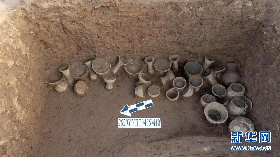 圖為河南葉縣余莊遺址標(biāo)號(hào)為T0405的探方出土的陶器,該組陶器擺放有序,呈現(xiàn)出鮮明的禮制色彩(11月3日攝)。新華社發(fā)(河南省文物考古研究院供圖)