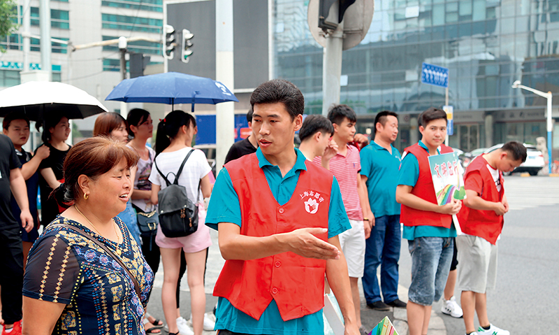 2018年夏季,快遞小哥柴閃閃在上海火車(chē)站南廣場(chǎng)恒豐路口做文明出行的指路志愿者