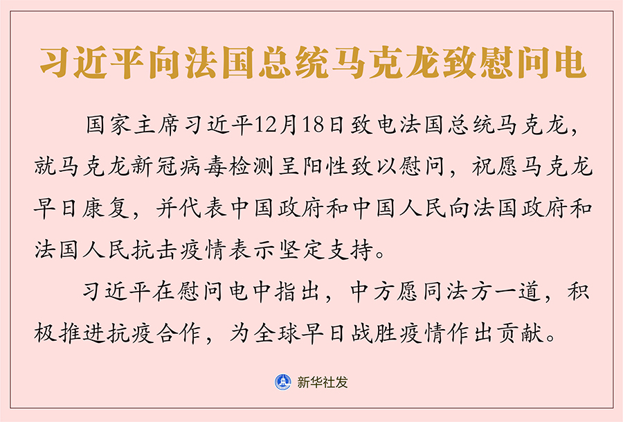 新華社北京12月18日電 國家主席習近平18日致電法國總統馬克龍,就馬克龍新冠病毒檢測呈陽性致以慰問,祝愿馬克龍早日康復,并代表中國政府和中國人民向法國政府和法國人民抗擊疫情表示堅定支持。