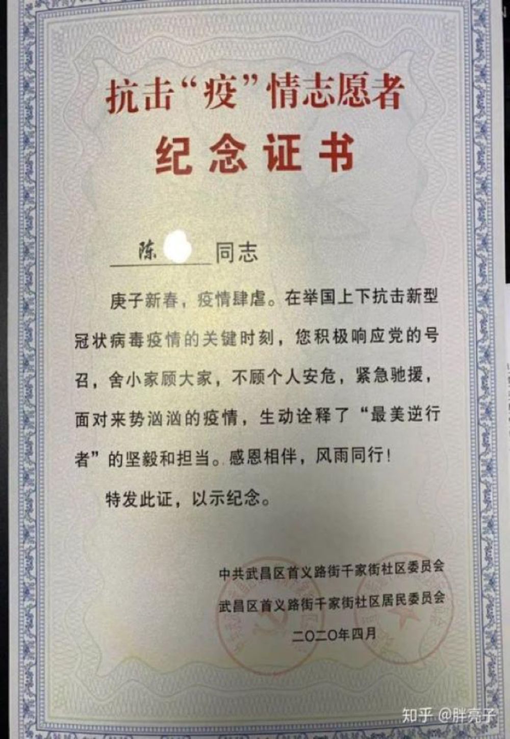在武漢,網(wǎng)友“胖亮子”說,2月底,他的妻子接到下沉社區(qū)做志愿者的通知,可以自愿選擇,但她很快答應(yīng)了。“平時(shí)有點(diǎn)潔癖而且膽小的老婆在這個(gè)時(shí)候能夠挺身而出,讓我刮目相看。”