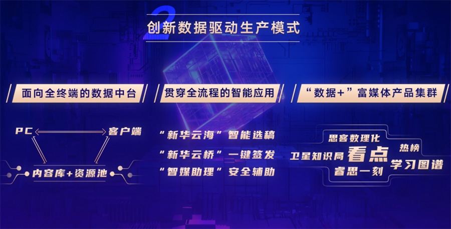 再造升級后的新華網突出“技術引領”,以“數據”為核心生產要素,為內容制作、聚合分發、用戶運營等提供全流程支撐,實現生產模式“由外而內”的變革。