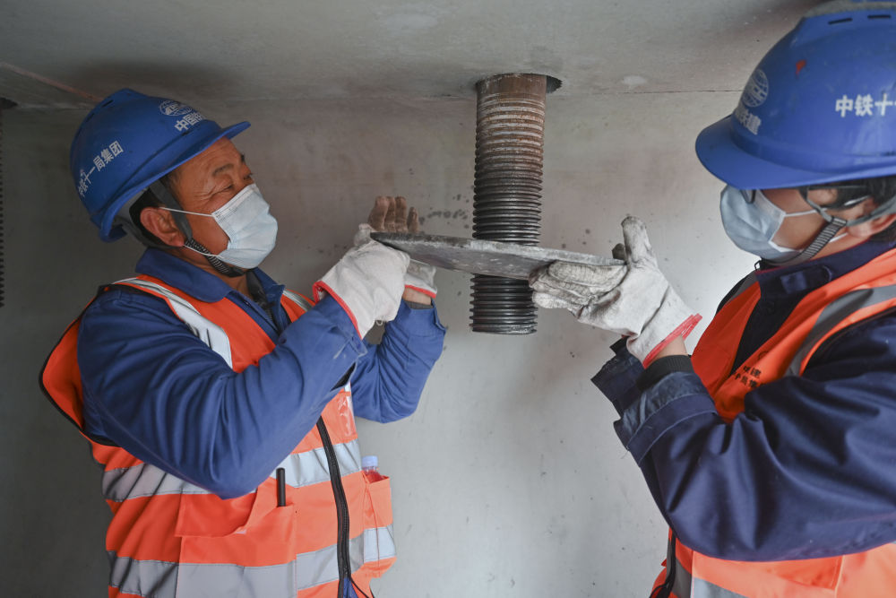 1月28日,杜學剛(右)和工友爬進箱梁,準備拆卸提梁固定螺栓。