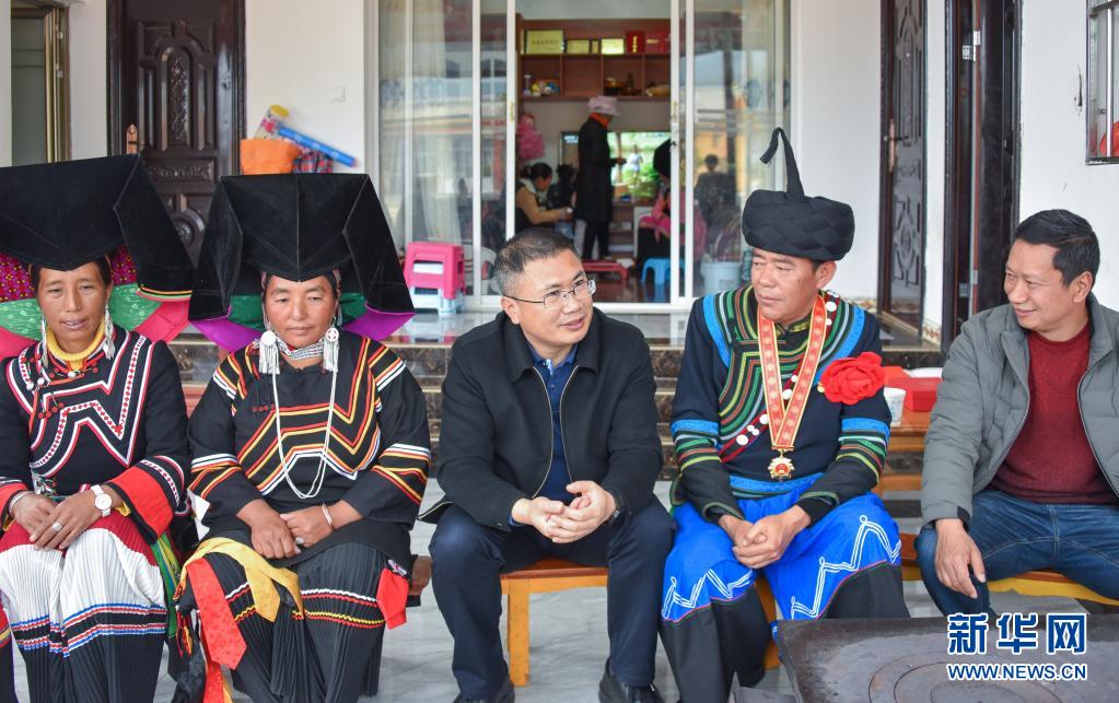 聶金輝(中)在老君山鎮新和村易地扶貧搬遷安置點索瑪小鎮看望慰問彝族群眾(3月3日攝)。新華社發(劍川縣融媒體中心供圖)