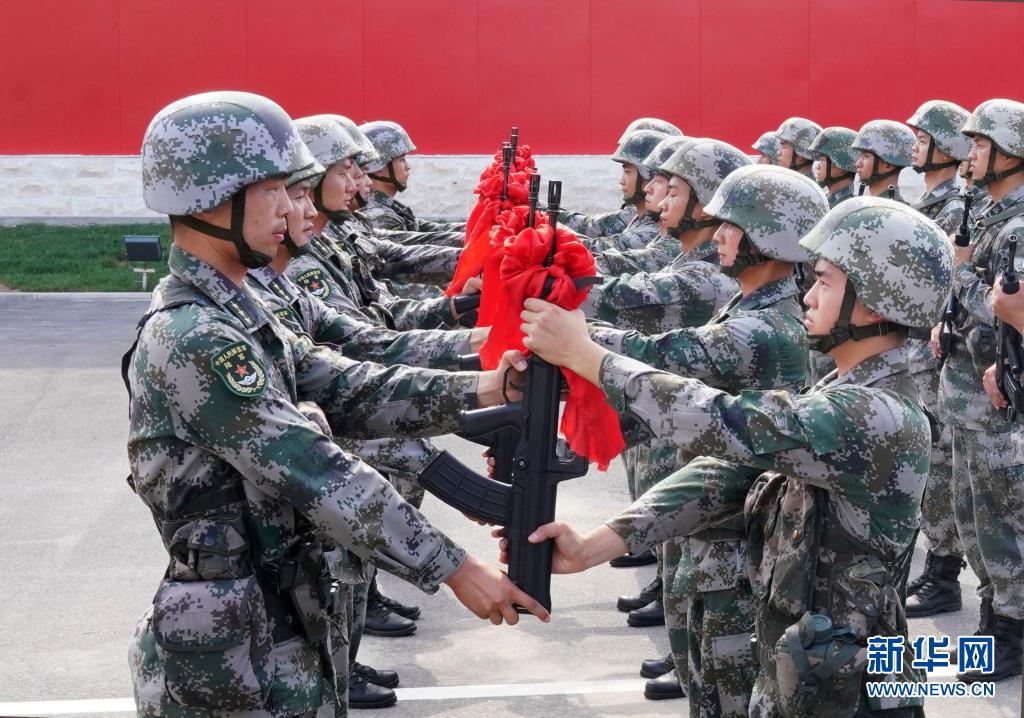 陸軍第83集團軍某旅“紅一連”黨支部為新戰士舉行授槍儀式(7月4日攝)。新華社記者 張永進 攝