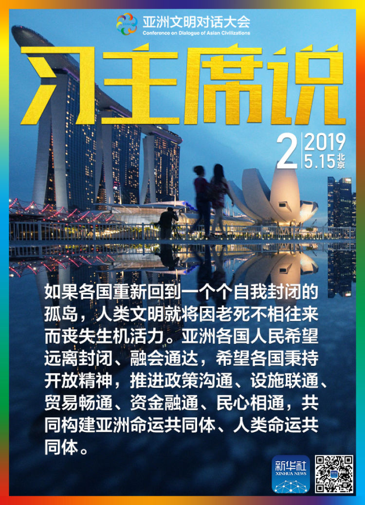 如果各國重新回到一個個自我封閉的孤島,人類文明就將因老死不相往來而喪失生機活力。亞洲各國人民希望遠離封閉、融會通達,希望各國秉持開放精神,推進政策溝通、設施聯通、貿易暢通、資金融通、民心相通,共同構建亞洲命運共同體、人類命運共同體。