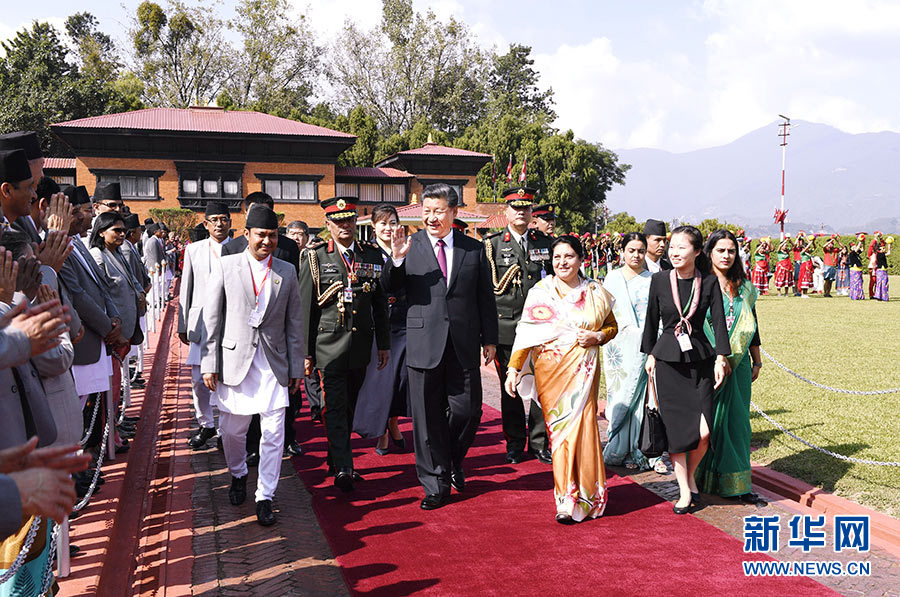 當(dāng)?shù)貢r間10月13日中午,國家主席習(xí)近平離開加德滿都啟程回國。尼泊爾總統(tǒng)班達(dá)里在機場為習(xí)近平舉行隆重歡送儀式。尼泊爾副總統(tǒng)普恩、總理奧利、聯(lián)邦議會聯(lián)邦院主席蒂米爾西納、所有內(nèi)閣成員、軍方高級將領(lǐng)參加。 新華社記者 高潔 攝