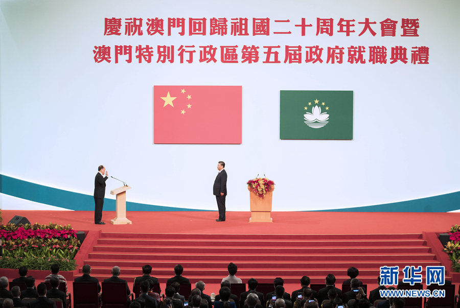 12月20日,慶祝澳門回歸祖國(guó)20周年大會(huì)暨澳門特別行政區(qū)第五屆政府就職典禮在澳門東亞運(yùn)動(dòng)會(huì)體育館隆重舉行。中共中央總書記、國(guó)家主席、中央軍委主席習(xí)近平出席并發(fā)表重要講話。 新華社記者 鞠鵬 攝