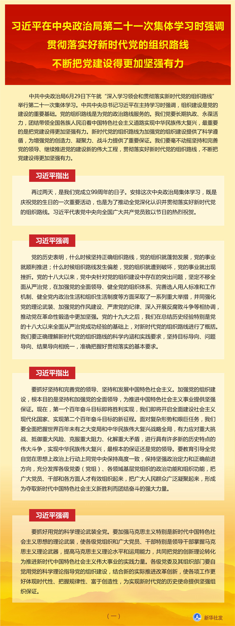 新華社北京6月30日電 中共中央政治局6月29日下午就“深入學(xué)習(xí)領(lǐng)會(huì)和貫徹落實(shí)新時(shí)代黨的組織路線”舉行第二十一次集體學(xué)習(xí)。中共中央總書(shū)記習(xí)近平在主持學(xué)習(xí)時(shí)強(qiáng)調(diào),組織建設(shè)是黨的建設(shè)的重要基礎(chǔ)。黨的組織路線是為黨的政治路線服務(wù)的。我們黨要長(zhǎng)期執(zhí)政、永葆活力,團(tuán)結(jié)帶領(lǐng)全國(guó)各族人民沿著中國(guó)特色社會(huì)主義道路實(shí)現(xiàn)中華民族偉大復(fù)興,最重要的是把黨建設(shè)得更加堅(jiān)強(qiáng)有力。新時(shí)代黨的組織路線為加強(qiáng)黨的組織建設(shè)提供了科學(xué)遵循,為增強(qiáng)黨的創(chuàng)造力、凝聚力、戰(zhàn)斗力提供了重要保證。我們要毫不動(dòng)搖堅(jiān)持和完善黨的領(lǐng)導(dǎo)、繼續(xù)推進(jìn)黨的建設(shè)新的偉大工程,貫徹落實(shí)好新時(shí)代黨的組織路線,不斷把黨建設(shè)得更加堅(jiān)強(qiáng)有力。