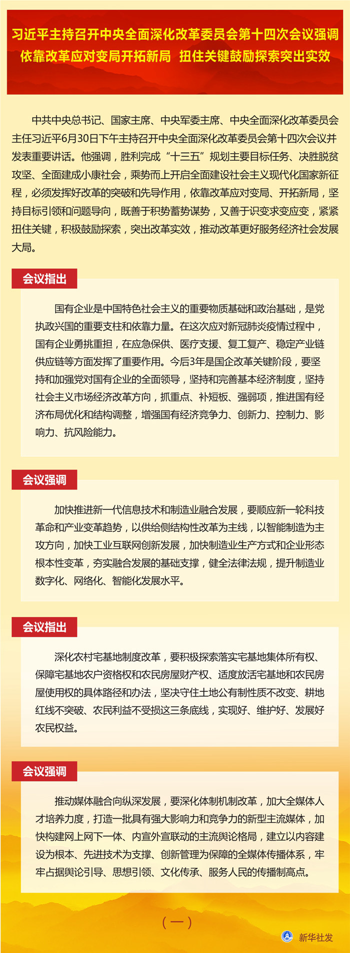 新華社北京6月30日電? 中共中央總書記、國家主席、中央軍委主席、中央全面深化改革委員會主任習近平6月30日下午主持召開中央全面深化改革委員會第十四次會議并發表重要講話。他強調,勝利完成“十三五”規劃主要目標任務、決勝脫貧攻堅、全面建成小康社會,乘勢而上開啟全面建設社會主義現代化國家新征程,必須發揮好改革的突破和先導作用,依靠改革應對變局、開拓新局,堅持目標引領和問題導向,既善于積勢蓄勢謀勢,又善于識變求變應變,緊緊扭住關鍵,積極鼓勵探索,突出改革實效,推動改革更好服務經濟社會發展大局。