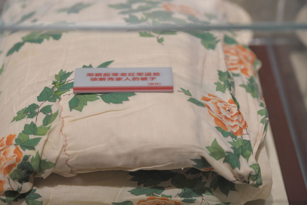 “在湖南汝城縣沙洲村,3名女紅軍借宿徐解秀老人家中,臨走時(shí),把自己僅有的一床被子剪下一半給老人留下了。”