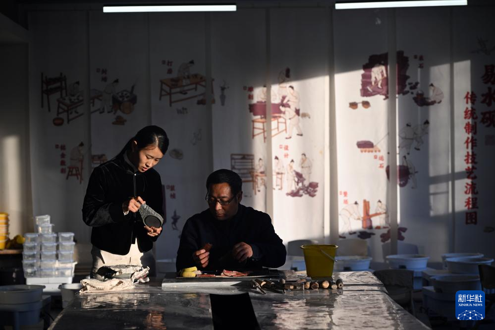 11月25日,邹天然(右)与父亲邹洪利在易水砚艺术馆内交谈。