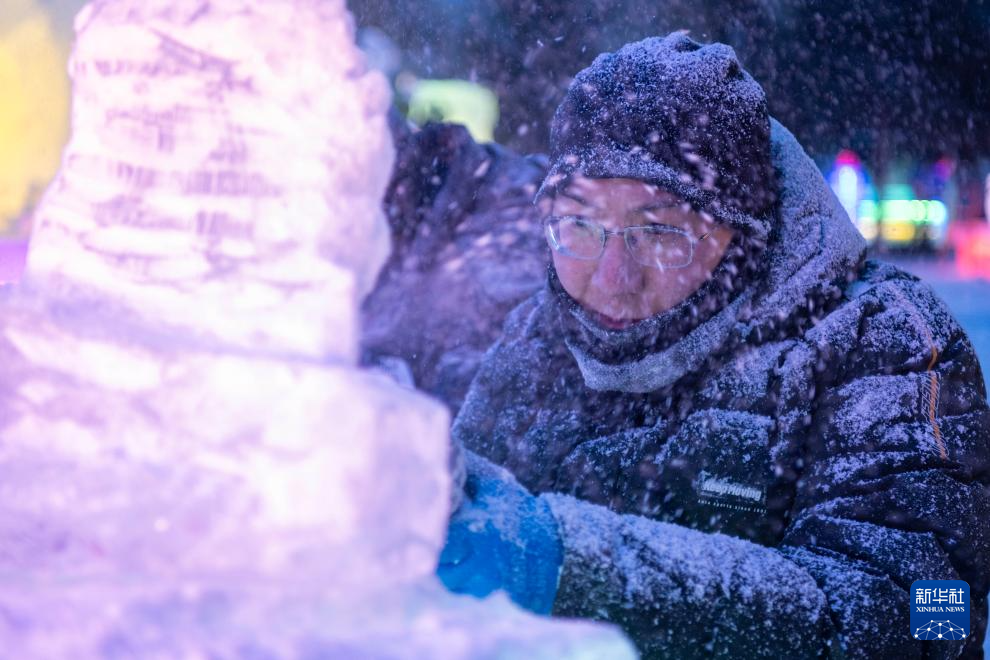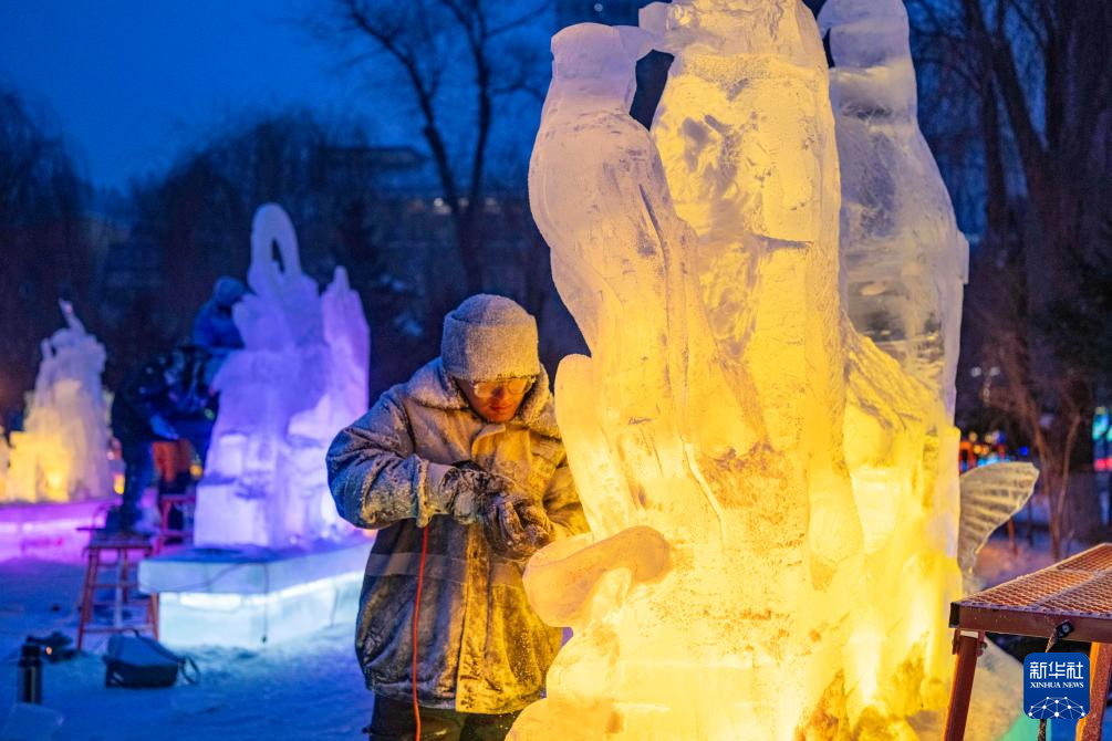 1月7日,在哈尔滨市兆麟公园,冰雕师在雕琢冰雕作品。