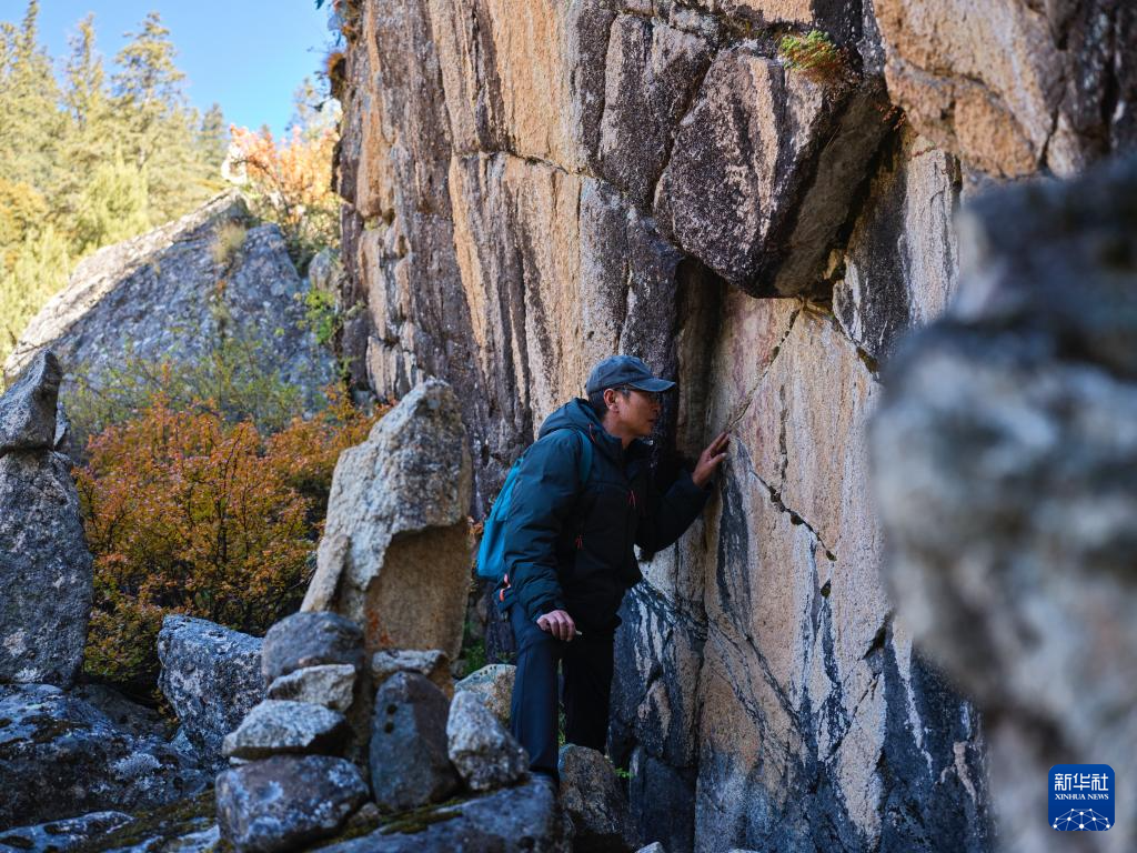 10月21日,陈雪松在实地调查海子山老林沟拉托扎岩画。该处岩画位于海子山南侧老林沟内,岩画由小型鹿图案、三角形以及X型符号组成。