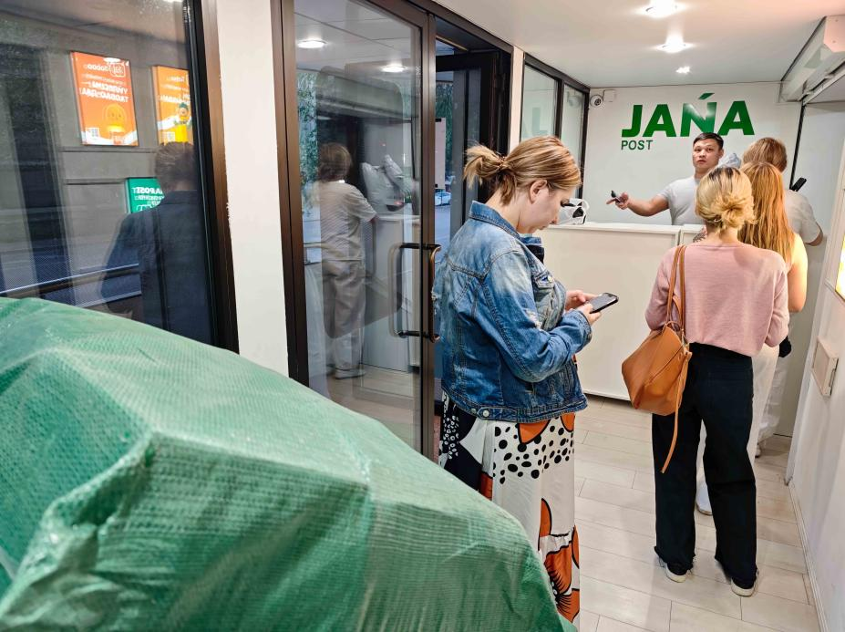 5月25日,在哈萨克斯坦阿拉木图,人们在一家主要负责中国网购平台物流服务的快递网点排队等待自提。新华社记者 李任滋 摄