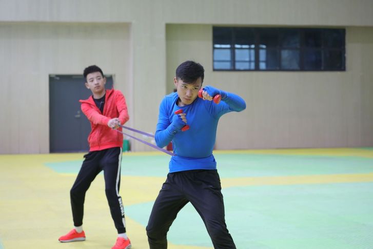 “通過啞鈴鍛煉肩部耐力,腳腕綁沙袋練習移動速度,用杠鈴加強出拳力量和爆發力,配合手靶全面練習。因為是從零開始,要想拿到成績,必須付出成倍的努力?!壁w佳偉說。