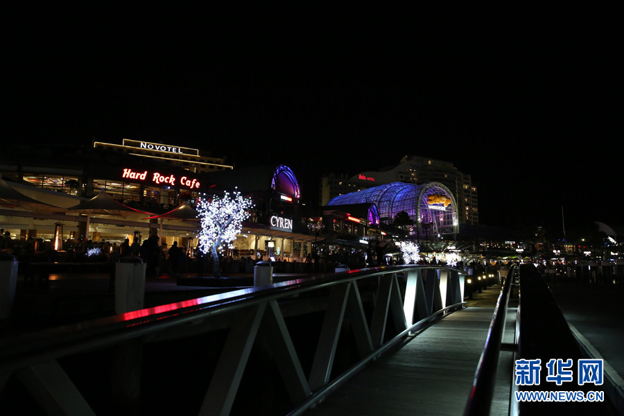 ????6月13日起,為期1個(gè)月的大型冬季冰雪活動(dòng)在悉尼市中心的情人港(Darling Harbour)為悉尼市民冬季的生活增添了些許名副其實(shí)的冬季氣氛。圖為情人港岸邊沿路的樹(shù)燈。。新華社記者 李冰 攝