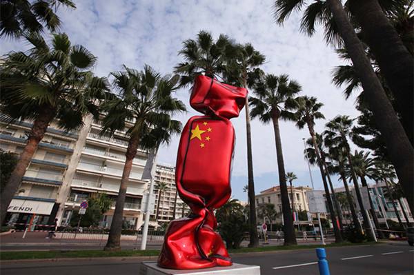 2011年11月3日至4日,G20領導人峰會在戛納舉行。圖為10月31日在法國南部小城戛納拍攝的外表被包裝成中國國旗的糖果雕塑。新華社記者高靜攝