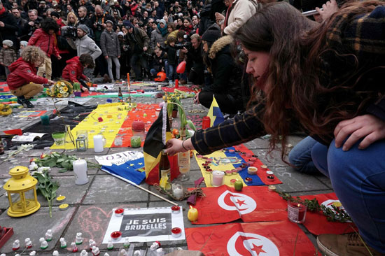 3月23日,在比利時(shí)布魯塞爾,人們在悼念活動中擺放蠟燭。22日在比利時(shí)首都布魯塞爾發(fā)生的系列恐怖襲擊已造成至少34人死亡,270多人受傷。事發(fā)后,布魯塞爾多地舉行活動,悼念恐怖襲擊事件中的遇難者。新華社/法新