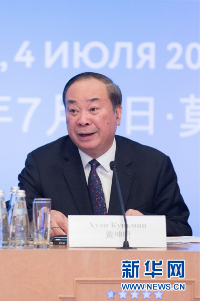 7月4日,中共中央宣傳部常務(wù)副部長(zhǎng)黃坤明在第三屆中俄媒體論壇上發(fā)言。新華社記者 吳壯 攝
