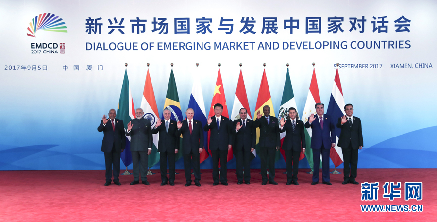 9月5日,國家主席習(xí)近平在廈門國際會議中心主持新興市場國家與發(fā)展中國家對話會并發(fā)表重要講話。金磚國家領(lǐng)導(dǎo)人巴西總統(tǒng)特梅爾、俄羅斯總統(tǒng)普京、印度總理莫迪、南非總統(tǒng)祖馬和對話會受邀國領(lǐng)導(dǎo)人埃及總統(tǒng)塞西、幾內(nèi)亞總統(tǒng)孔戴、墨西哥總統(tǒng)培尼亞、塔吉克斯坦總統(tǒng)拉赫蒙、泰國總理巴育出席對話會。這是對話會前,習(xí)近平同出席對話會的各國領(lǐng)導(dǎo)人集體合影。