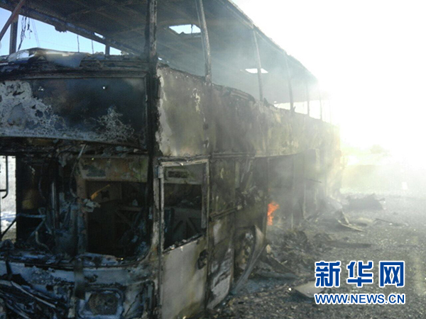 哈薩克斯坦內(nèi)務(wù)部緊急情況委員會提供的照片顯示,這輛大客車已焚毀,只剩下空殼。目前,哈緊急情況委員會尚未透露大客車起火原因。