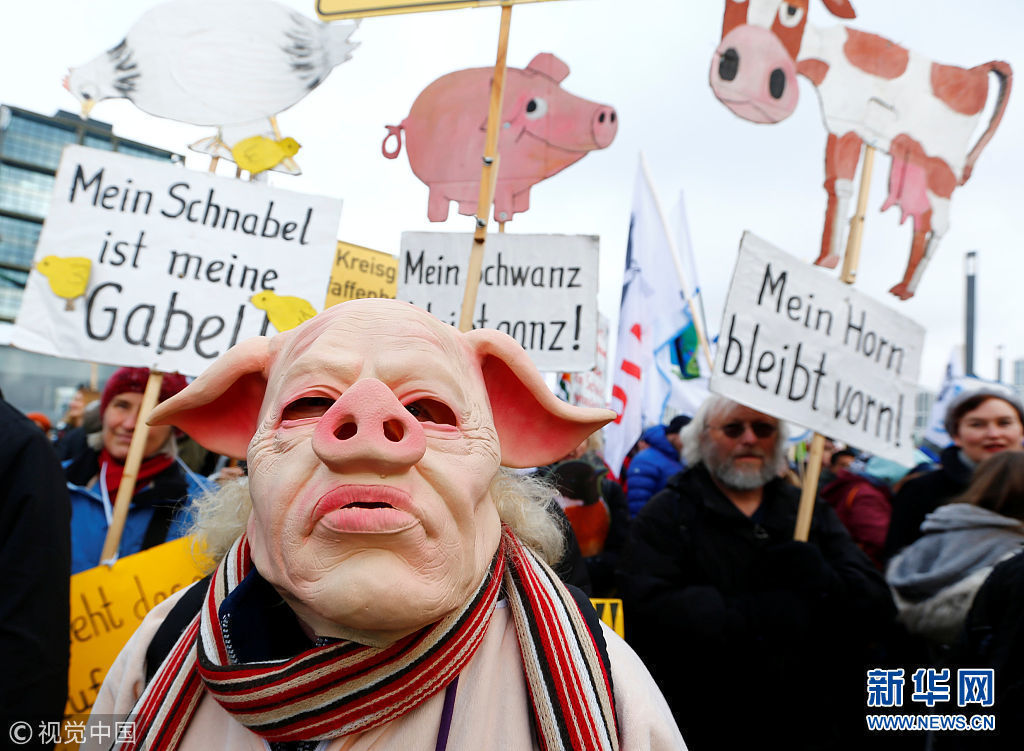 當?shù)貢r間1月20日,德國柏林,農(nóng)民們裝扮成家畜游行,抗議柏林國際綠色周舉行,要求更多生態(tài)農(nóng)業(yè)項目。 (圖片來源:視覺中國)