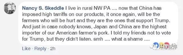 ?。ň幷咦ⅲ何易≡谫e州西北部農村…中國準備對我們的產品加征關稅,曾支持特朗普的農民會再次受傷……我告訴過我的朋友不要給特朗普投票,但他們不聽。哎,太無語了……)