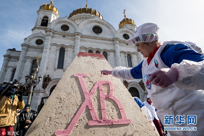 當地時間2018年4月8日,俄羅斯莫斯科,為慶祝東正教復活節,莫斯科救世主大教堂前現一個1141公斤的傳統復活節蛋糕,打破吉尼斯世界紀錄。(圖片來源:東方IC