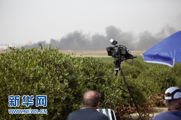 正午的驕陽烤得人大汗淋漓,被大風卷起的黃沙一個勁地往眼睛里鉆。雖然記者的眼睛經常被汗水和沙子蹂躪地睜不開,但是這并不妨礙記者用相機和攝像機記錄下加沙地帶那一頭發生的一幕幕。抗議的巴勒斯坦人燃燒輪胎所產生的濃煙,遮住了大片天空,刺鼻的焦味隨風飄散。