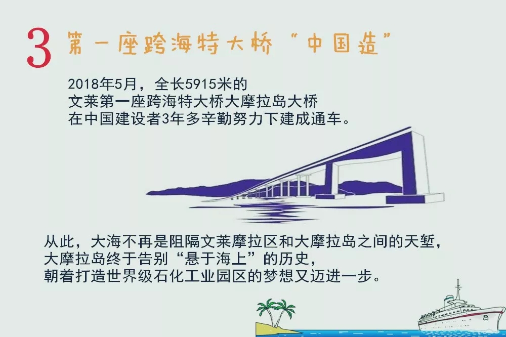 今年5月,全長5915米的文萊第一座跨海特大橋大摩拉島大橋在中國建設者3年多辛勤努力下建成通車。從此,大海不再是阻隔文萊摩拉區和大摩拉島之間的天塹,大摩拉島終于告別“懸于海上”的歷史,朝著世界級石化工業園區的夢想又邁進一步。