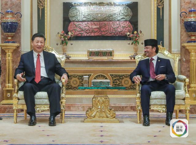 11月19日,國家主席習近平在斯里巴加灣同文萊蘇丹哈桑納爾舉行會談。這是習近平同哈桑納爾親切交談。新華社記者 鞠鵬 攝