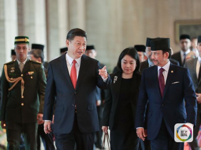 11月19日,國家主席習近平在斯里巴加灣同文萊蘇丹哈桑納爾舉行會談。這是會談前,習近平同哈桑納爾步入會場。新華社記者 鞠鵬 攝