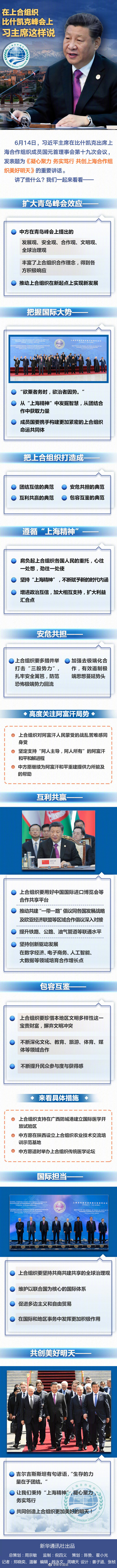 6月14日,習近平主席在比什凱克出席上海合作組織成員國元首理事會第十九次會議,發表題為《凝心聚力 務實篤行 共創上海合作組織美好明天》的重要講話。