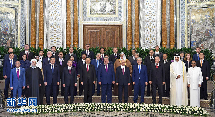 6月15日,亞洲相互協作與信任措施會議第五次峰會在塔吉克斯坦首都杜尚別舉行。國家主席習近平出席峰會并發表重要講話。這是出席會議的亞信成員國領導人或代表,觀察員國代表以及有關國際和地區組織代表集體合影。 新華社記者 張領 攝
