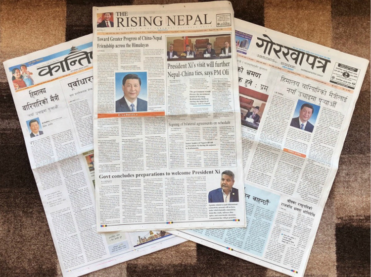 10月11日,尼泊爾3份報(bào)紙頭版刊登習(xí)近平主席的署名文章,題為《將跨越喜馬拉雅的友誼推向新高度》。新華社記者王婧嬙攝