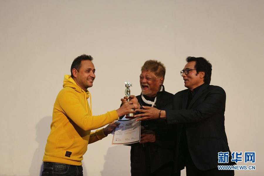 2月17日,第三屆尼泊爾國際電影節(jié)的閉幕儀式在加德滿都市政大廳內舉行,資深電影人士正在給獲獎者(左)頒獎。本屆電影節(jié)2月13日開始,一共有來自40個國家和地區(qū)的80部影片入選,其中中國和哈薩克斯坦聯合拍攝的《音樂家》作為開幕電影,備受關注。記者 唐薇 攝?