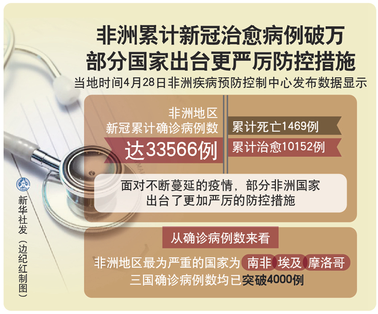 新華社洛美4月28日電 綜合新華社駐非洲地區(qū)記者報道:非洲疾病預(yù)防控制中心28日發(fā)布數(shù)據(jù)顯示,非洲地區(qū)新冠累計確診病例數(shù)達(dá)33566例,累計死亡1469例,累計治愈10152例。面對不斷蔓延的疫情,部分非洲國家出臺了更加嚴(yán)厲的防控措施。
