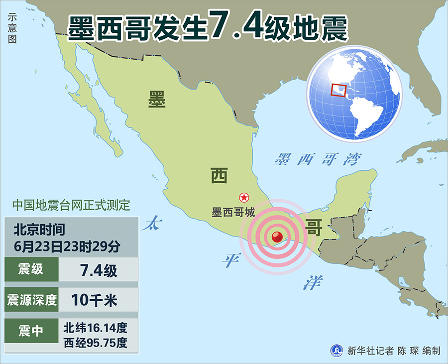 新華社北京6月23日電 據中國地震臺網正式測定:6月23日23時29分在墨西哥(北緯16.14度,西經95.75度)發生7.4級地震,震源深度10千米。