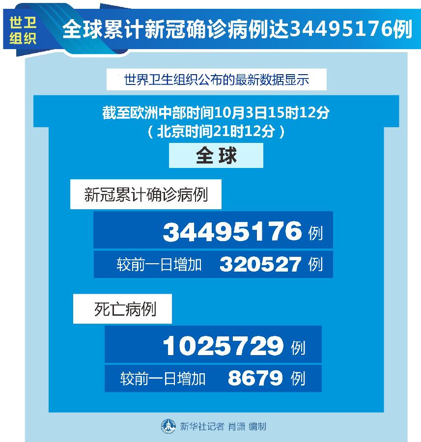 新華社日內瓦10月3日電(記者劉曲)世界衛生組織3日公布的最新數據顯示,全球累計新冠確診病例達34495176例。