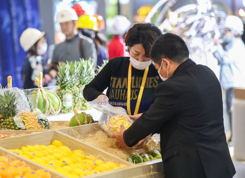 11月2日,在食品及農產品展區,一企業展臺的工作人員在擺放展品。連日來,第三屆中國國際進口博覽會舉辦地國家會展中心(上海)內一派忙碌景象,各個展館的搭建和布置工作正有條不紊地進行。新華社記者 丁汀 攝