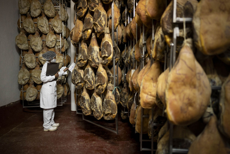 10月28日,在阿根廷首都布宜諾斯艾利斯附近的馬科斯·帕斯,一名工人檢查火腿的制作情況。這座人口僅有6萬多人的小鎮以城市之名報名參加第三屆進博會。新華社發(馬丁·薩巴拉攝)