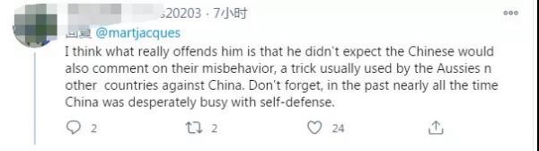 在這條推特下邊,許多網友為馬丁·雅克點贊。其中一位網友說道:“我認為真正讓他惱火的是,他沒想到中國人也會對他們的不當行為發表評論,這是澳大利亞人和其他國家對付中國的慣用伎倆。別忘了,在過去幾乎所有的時間里,中國都在拼命地進行自衛?!?/p>