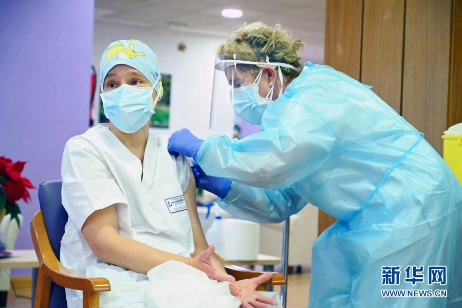 12月27日,護工莫妮卡·塔皮亞斯(左)在西班牙瓜達拉哈拉的洛斯奧爾莫斯養老院內接受新冠疫苗注射。